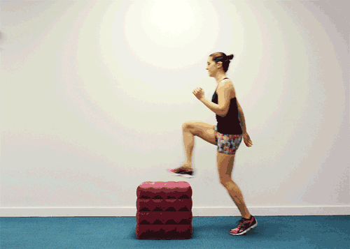 Si no cuentas con estos escalones especiales, puedes ayudarte con un banco, una silla, escaleras o cualquier cosa firme que te funcione. Este ejercicio es muy útil, para fortalecer y equilibrar el tronco del cuerpo.