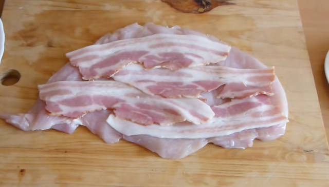 Después dispón sobre la pechuga las tiras de beicon uniformemente
